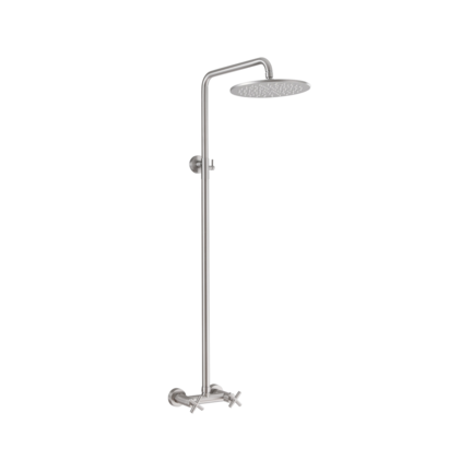 Ducha exterior en acero inoxidable (SS 304). Acabado en níquel cálido con válvula de mezcla y cabezal de ducha redondo con un diámetro de 25 cm. Preparada para agua fría y caliente a través de conexión desde la parte trasera/pared. La ducha es simple y elegante en su diseño aerodinámico.